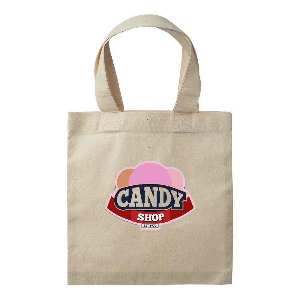 "These miniature cotton gift bags are crafted from 4 oz cotton material and are designed for various gifting needs. They are equipped with self-fabric handles for ease of carrying, feature an open main compartment, and possess a gussetted flat bottom for stability. These bags present a reusable alternative to conventional gift bags, promoting sustainability while maintaining functionality.
